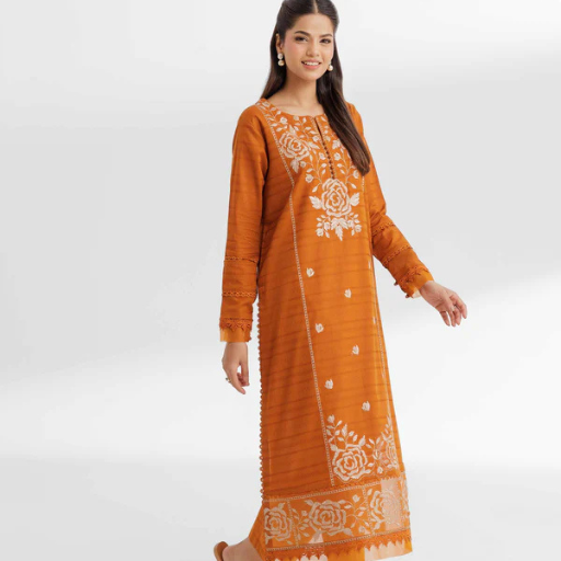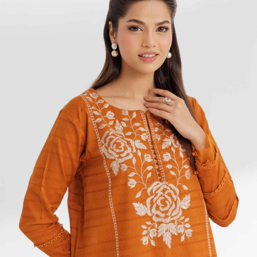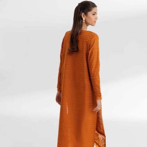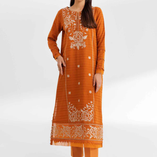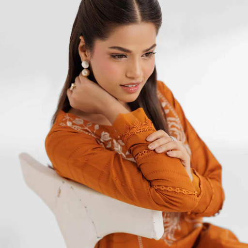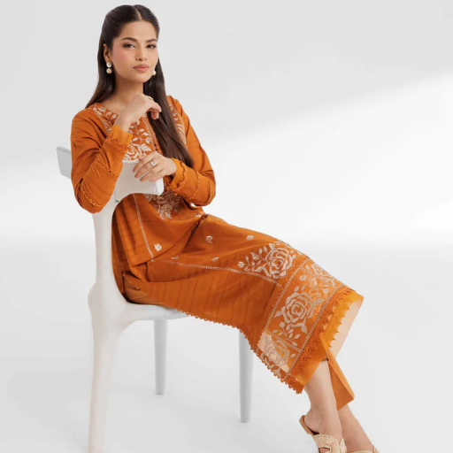 - Set: High-quality unstitched 2-piece set in a vibrant rusty orange palette.
